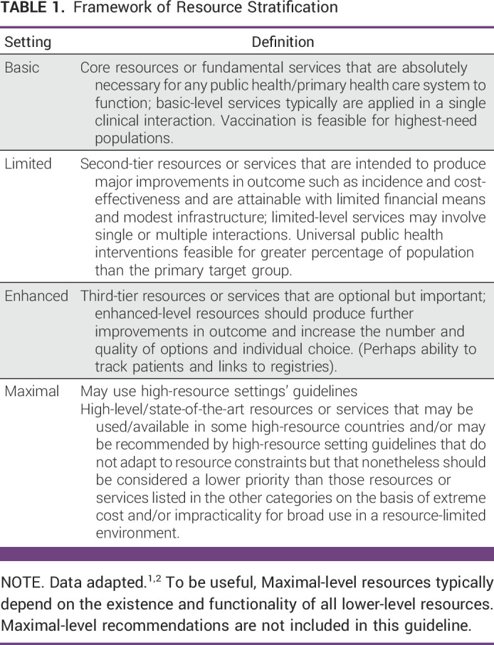 The four-level resource approach used in the development of the guidelines ranges from basic to maximal level, considering between the two extremes: a limited and an advanced context (in ascending order of resources we have, therefore, 1. basic context, 2. limited context, 3. advanced context, 4. maximal context). This framework recognises the variations not only between but also within countries. Below we provide the table as indicated in the guidelines.