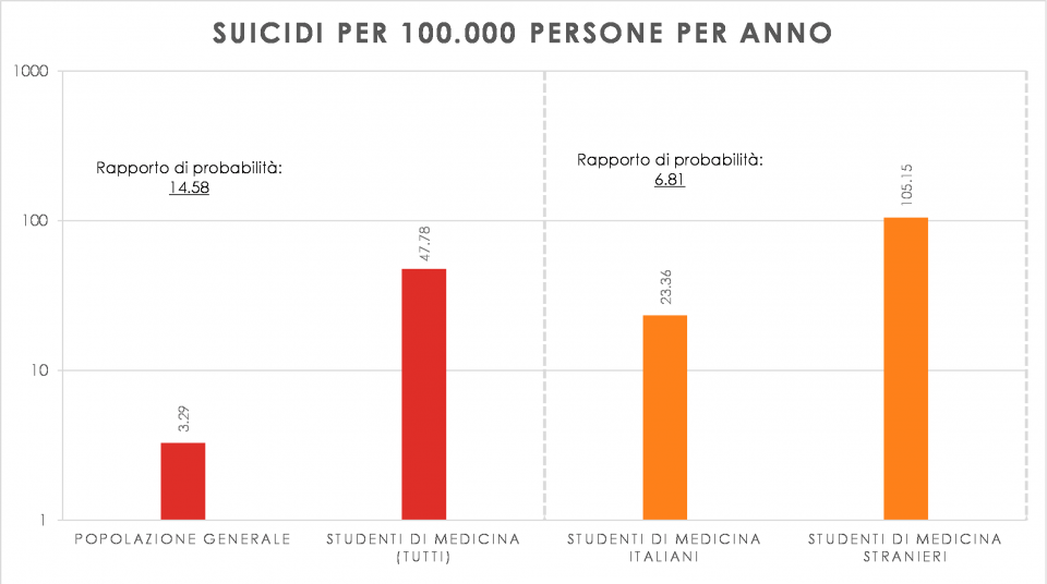 Comparative data of suicide cases per 100k people/year, betwen general population and medical students, and comparative discrimination between italian and foreign medical students. Data from research by Tarchi et al.9